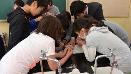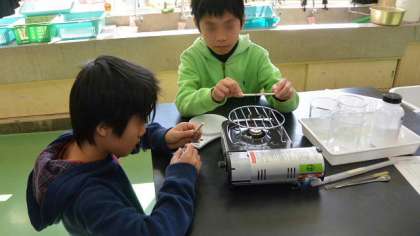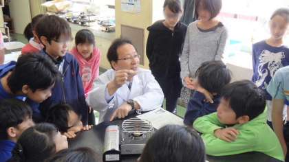 11日(水)、先週に続いて5年2組の理科、校長特別授業をしました。内容は先週と同じ「ミョウバンの結晶づくり」です。説明の後、さっそく実験です。大きな結晶の種になる結晶を選ぶ目は真剣です。ちなみに形がよくて、できるだけ透明な物を選ぶときれいな結晶ができます。種結晶を熱したエナメル線につけるのも、ほとんどみんなが自分でできました。