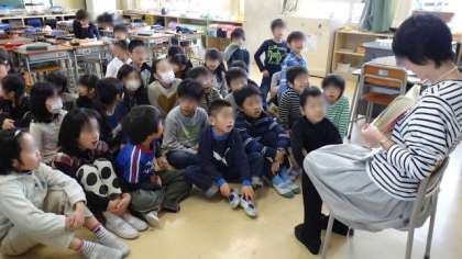 13日(金)、今朝は1・2年生の各クラスで読み聞かせをしていただきました。写真は2年生のようすです。読み手のみなさんが、絵本をたんに読むだけでなく、子どもたちの反応を見ながら、物語の世界にどんどん引き込んでくださっています。