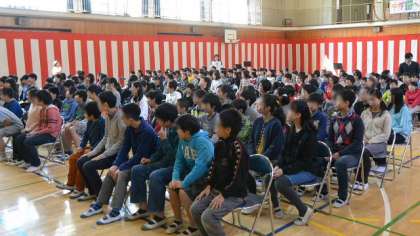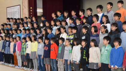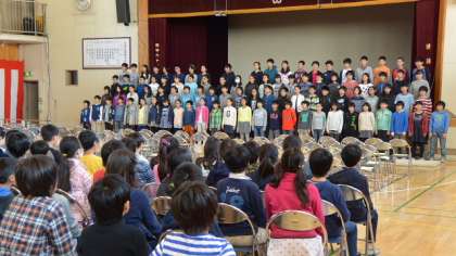 13日(金)5・6校時、5・6年生が一緒に卒業式の呼びかけの練習をしました。一堂に会して練習するのは初めてです。ちょっと緊張気味な感じでスタート。一人一人の声もよく通っています。