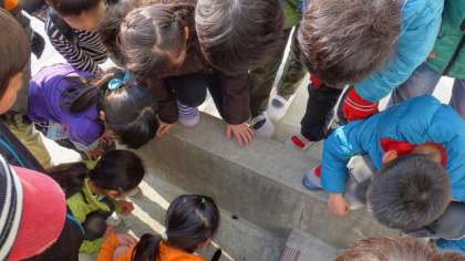 14日(土)朝、登校してきた2年生がなにやら集まっています。何かと思ってのぞいてみると・・・大きなゴキブリでした。生きているのですが、みんなに囲まれているにもかかわらず動きません。春の日差しに誘われて出てきたものの、気温が低くて動けなくなったのでしょうか? こんなにじっくり観察できたのは初めてのようで、なかには「けっこうかわいいね」という子も・・・