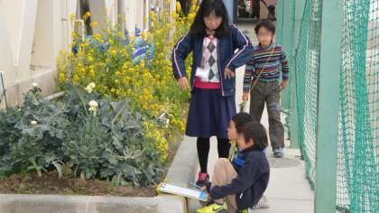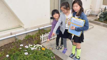 天気はあまりよくなかったのですが、風もなく気温も高めで春の気配がこくなった16日、2年生が生活科で、学校の花壇などで自然観察をしました。草花の微妙な変化にも気付き、よく観察していました。