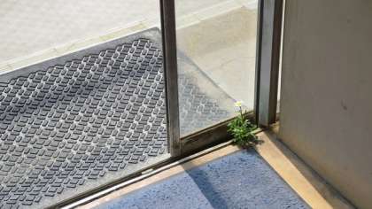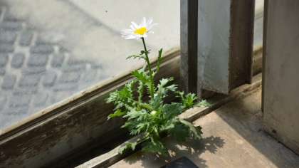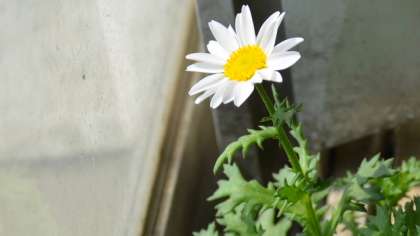 ノースポールの花が咲いています。「あれっ?なぜこんなところに?」実はここ、職員室の前方、校庭への出口のガラス戸の手前なのです。アルミサッシと床材のわずかな隙間に根を下ろして、暖かい日差しを浴びて育ち、一足先に花を咲かせました。植物の生命力を感じます。