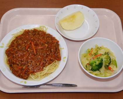 スパゲッティミートソース 牛乳 イタリアンサラダ りんご