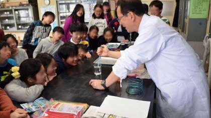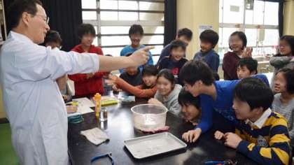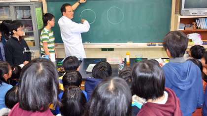 19日(木)、2、3、4校時に、卒業を直前に控えた6年生の各クラスで1時間ずつ、校長特別授業として理科実験をしました。内容としては「表面張力」と「洗剤(界面活性剤)」に関わる内容で、「水に浮く針金」と「水中シャボン玉」の実験です。最初に原理と実験方法を説明しました。みんな興味津々で注目です。