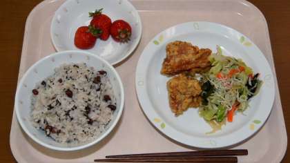 お赤飯 牛乳 鶏肉のから揚げ かむかむ海藻サラダ いちご