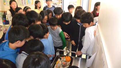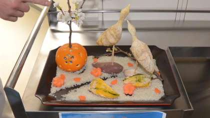 20日(金)昼、6年生の教室前に写真のような飾りが。実は給食調理のみなさんが、卒業祝いということで、野菜を包丁で細工して飾りを作ってくださいました。さすがプロです。調理室のチーフも説明のため廊下に来てくれました。それを見つけた6年生に、この飾りは大人気でした。