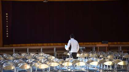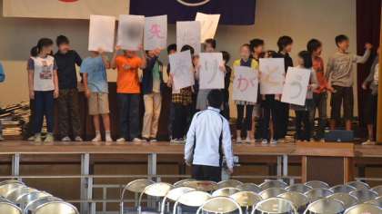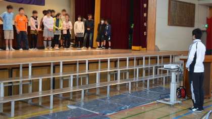 明日は修了式、そして明後日は卒業式で、6年生にとって二子玉川小ですごす日は、今日も合わせて残り3日となった23日(月)。それぞれのクラスのようすをお伝えします。まずは2組。朝、他より一足先に登校した子どもたち。ところがチャイムがなって担任が教室に行くと、なんと子どもたちがいません。書き置きがしてあって担任が体育館に行くと・・・舞台の幕が開いて、感謝の言葉をもった子どもたちがずらりとならんでいました! そして、みんなからの感謝のメッセージが担任に贈られました。うれしいですね。