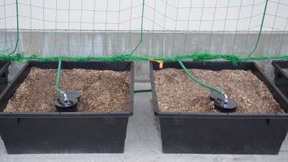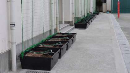 体育館西側に「グリーンカーテン」のための、大型プランターと体育館屋上まで届くネットを全面に設置しました。これは世田谷区の緑化事業の一環で、この後ヘチマとゴーヤ、キュウリを植え付けます。水やりは自動灌水装置がついているので不要です。夏までにはツルがぐんぐん伸びて、緑のカーテンができる予定です。キュウリやゴーヤの収穫もできますので、収穫物は子どもたちに持ち帰らせることも考えています。秋にはいったんネットだけを取り外して、春まで、プランターで花を栽培する予定です。
