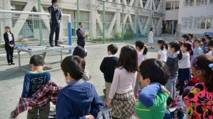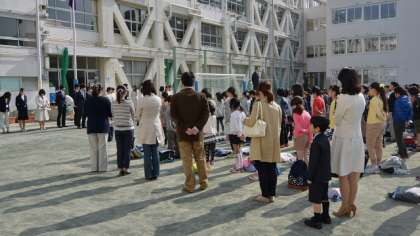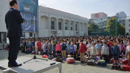 カバンを足下に置き、整列して始業式が始まりました。転校してきた児童も保護者の方と一緒に並んで参加します。校長講話の後、転出、転入職員の紹介を行い、転入職員があいさつをしました。発表するたびにさまざまな反応がわき起こりました。