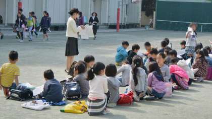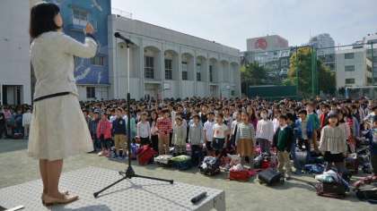 いよいよ担任発表です。名前を発表し、担任が子どもたちの前に歩いて行くと、子どもたちの目が注がれ、どよめきが起こりました。そろったところで、みんなで一斉に「よろしくお願いします」とあいさつをしました。最後は校歌です。晴れた空に元気な歌声が響きました。始業式の後は、入学式に参列する6年生と歓迎のセレモニーをする2年生以外は、校庭で配布物などを受け取り、すぐに下校しました。担任と、そして新しいクラスメイトとのコミュニケーションは明日までお預けです。楽しみにね。