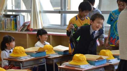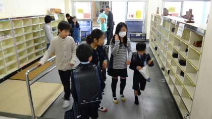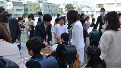 6日(月)、始業式の後は入学式、小学校生活スタートです。保護者、家族のみなさんと一緒に真新しいランドセルを背負って登校してくる1年生。受付をすませて、6年生のお兄さんお姉さんに連れられて教室に向かいます。家族と別れるのがちょっと不安そうなようすでしたが、6年生がやさしく接してくれたので平気です。
