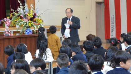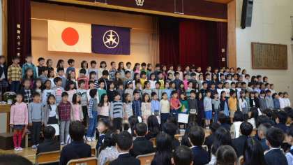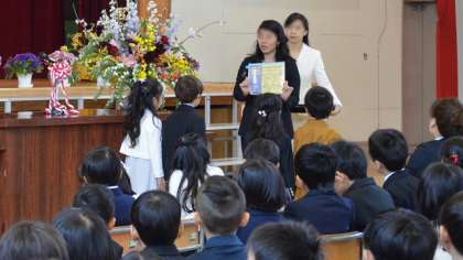 1年生の代表に、入学の記念品として、PTAからは連絡帳ケースが、同窓会からは二子玉川の木ともいうべき、ハナミズキの苗木が贈られました。続いて2年生による歓迎のセレモニーです。3月に一生懸命練習して、この日に備えました。学校生活の紹介を呼びかけと絵で行い、最後にみんなで元気よく歌いました。その元気な歌声に、1年生が目を丸くしていました。