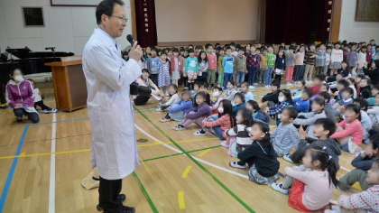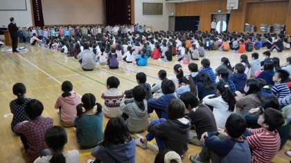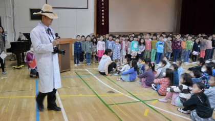 代表委員による司会で、会が始まりました。最初は学校長の話です。白衣と麦わら帽子、一眼レフカメラをもって舞台袖から登場。「私は怪しいものではありません」(麦わら帽子をとって)「お医者さんでもありません」「時には理科の先生です」(白衣を脱いで、カメラをかまえて)「時にはカメラマンにもなります」「そしていつもは校長先生です」・・・「さあ今日から二子玉川小学校の仲間入りだね」歓迎のことばを述べました。とてもしっかりと話を聞けていました。