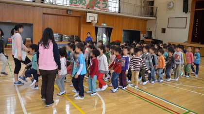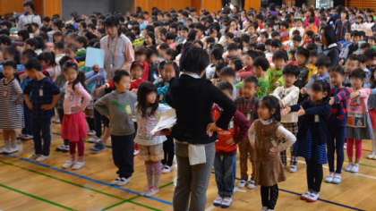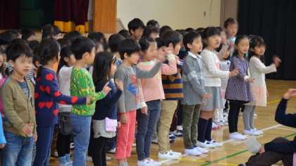 1年生の熱演に、会場の2年生から6年生までの全校児童から、大きな拍手がおくられました。その後、朝会や集会で体育館に集まるときの並び方を練習して、1年生を迎える会はとても良い雰囲気で終わることができました。教室への退場も、音楽に合わせてしっかりできた1年生です。りっぱな1年生です。