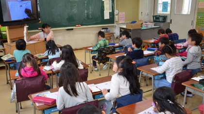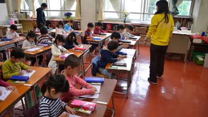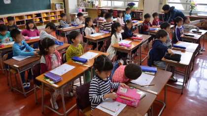 何事も最初が肝心。学習帳の使い方や鉛筆の持ち方など、担任は工夫して指導しています。学習を補助する教員もついています。