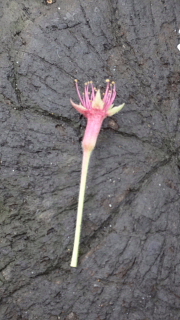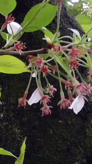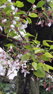 学校の桜の樹は、校舎の東側に並んでいます。先週紹介したように、東門脇の樹はヤマザクラの一種で、他はソメイヨシノです。写真は14日朝、雨に打たれながらも咲き残っているソメイヨシノのようすです。ソメイヨシノは不稔性で自家受粉はできないので、花びらが散った後、実をならせることなく花柄の部分もろとも落ちてしまいます。(ソメイヨシノは、必ずしも種子が出できないことはなく、ソメイヨシノ以外の桜の品種が近くにあった場合、実がなることもあります。)