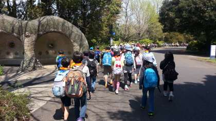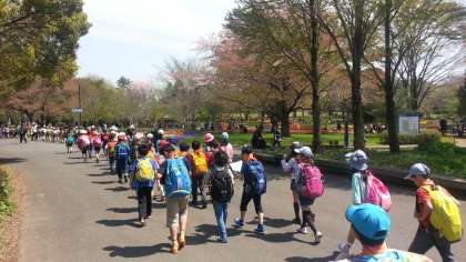 子どもの森をめざして、みんなで歩いていきました。途中きれいなお花畑もあって、とても気持ちがいい公園です。