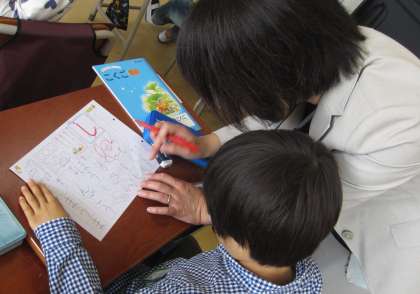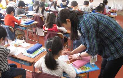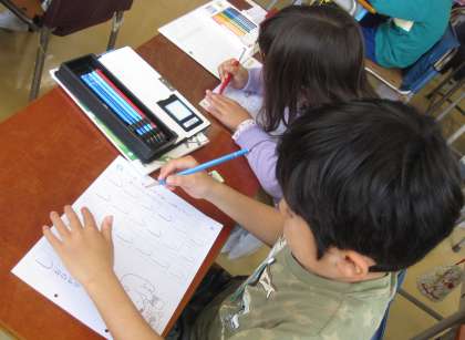 ひらがなの学習をしています。集中して真剣な表情をして取り組んでいます。4組は「し」,1組は「へ」の文字を練習していました。ていねいに書こうという気持ちが伝わってきました。担任から花まるをもらってうれしそうでした。