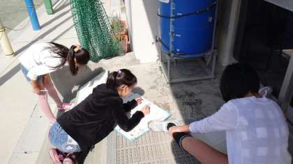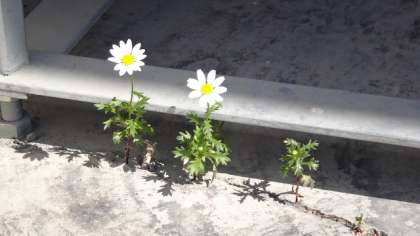 図工で花のスケッチをしていた6年生が、玄関脇の雨水利用タンクの下のコンクリートのひびに根を降ろして咲いているノースポールを見つけ、絵を描いていました。昨日紹介したものもたくましい生命力を感じさせますが、こちらもど根性ですね。