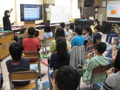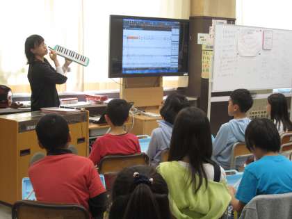 パソコンソフト,スコアメーカーを活用して学習しています。テレビ画面の楽譜を目で追いながら,演奏しています。鍵盤ハーモニカでは,音の止め方を確認していました。リコーダー演奏では,美しい音色が音楽室に広がりました。