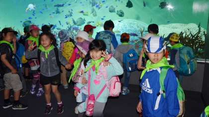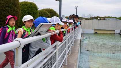 昼食後、水族園の見学をしました。2年生になったばかりのこの時期ですが、グループごとにわかれての見学に挑戦しました。お互い、「あっちに行ってみよう」「もうちょっとみていないのになあ」などと言いながらも、互いにゆずり合いながらしっかりとグループがまとまって見学することができました。