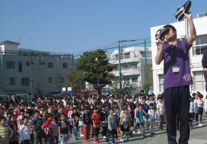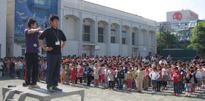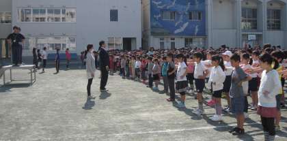 23日(木)の体育朝会は、全校で行いました。今日学習したことは、集団行動です。担当教諭が「気をつけ」「前へならへ」「休め」「回れ右」のやり方を具体的に分かりやすく、手本を示しながら説明しました。子どもたちはしっかりと理解し、できるようになりました。