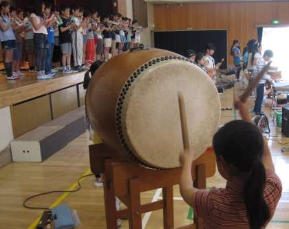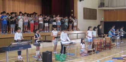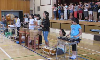 学年合同の音楽の授業を体育館で行いました。29日の花みず木フェスティバルで「八木節」と「茶色のこびん」を演奏します。4年生の時から練習を重ね、演奏技術が大きく向上しました。迫力のある演奏は、見ごたえがあります。態度もすばらしく、当日が楽しみです。
