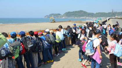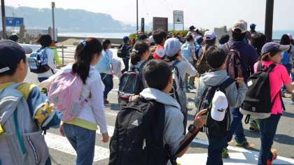 27日(月)、6年生が鎌倉へ遠足に行きました。そのようすは速報版で現地からお知らせしましたが、今日を振り返って、子どもたちの楽しそうなようすを改めてお伝えします。今日は晴天で気持ちのよい青空が広がる初夏のような天候になり、気温もうなぎ登り。予定よりバスが早く到着したので、由比ヶ浜まで脚を伸ばしました。夏のような海を見て、「海にはいりたいなあ」という感想でした。浜辺の工事をやっていて、海辺まで行けなかったのが残念です。