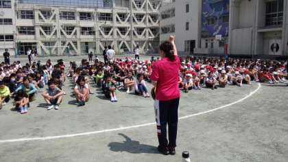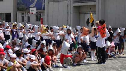 28日(火)、今年度最初の避難訓練を行いました。火災発生の想定で、基本的な避難のしかたを身につけるのが目標です。初めて参加した1年生も、しっかり「おかしも」の約束を守り、防災ずきんをかぶって口にハンカチをあてて、秩序正しく避難できました。また、どの学年もしっかりできていたので、最初でしたが90点をつけました。万が一に備えてこれからも訓練を重ねて、100点をめざしていきます。