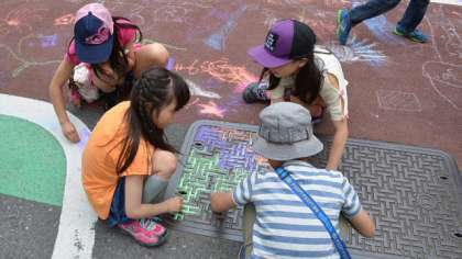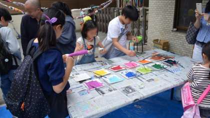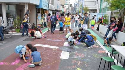 本校の西門前の二子玉川商店街では、協賛事業「アート&マート」が開催され、普段できない道路にチョークで落書きや、手作りアートの作品作り、食べ物や小物の販売など、楽しい雰囲気でいっぱい。本校の児童もたくさん参加して楽しんでいました。