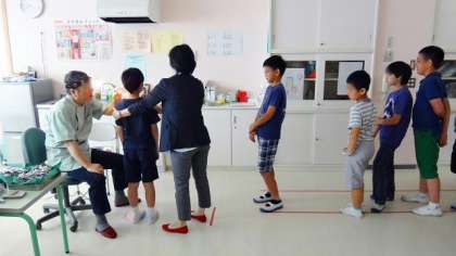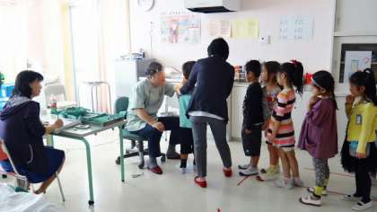 7日、今日は全学年で耳鼻科検診をしました。写真は1年生と5年生のようすです。検診の時のルールとして、「校医さんの前に立ったらしっかり自分の名前を言う」「待っている間はおしゃべりをしない」というのがあるのですが、1年生もしっかりできていました。さらに5年生は、それを上回り、見本になるようにパーフェクトにできていました。さすが高学年です。