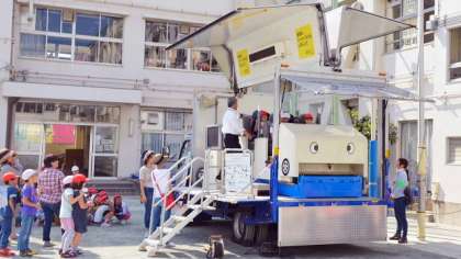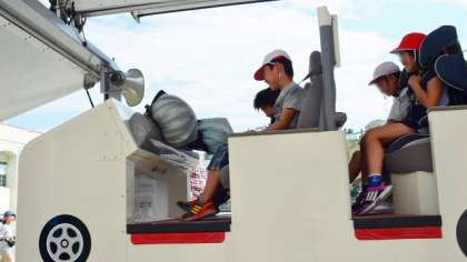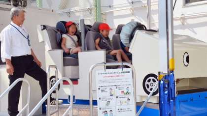 続いて、子どもたちの体験コーナーです。シートベルトの大切さを体験する「シートベルトコンビンサー」は、実際にシートに座ってシートベルトを装着し、時速5キロで衝突を体験する機械です。時速5キロとあなどってはいけません。実際に体験すると想像以上の衝撃に肝を冷やします。この体験を通して、自動車に乗ったときのシートベルト装着の大切さがわかったと思います。