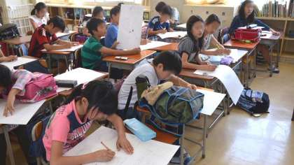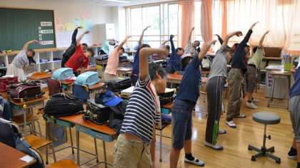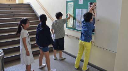 8日6校時は、5・6年生の委員会活動の時間です。4年生の代表も所属している代表委員会を含めると、10の委員会があり、5・6年生はどれかの委員会にかならず所属しています。委員会の日として月に一度設定している時間は、主に活動の計画や反省について話し合いをしています。委員会の中には、この時間に活動をしているところもあります。写真は運動会のラジオ体操の練習をしている運動委員会、校内の掲示板の掲示物をはり替えている環境委員会、虫歯予防のポスターを制作中の保健委員会のようすです。