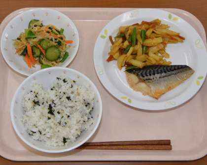 わかめごはん 牛乳 さばの塩焼き じゃがいものきんぴら 切り干し大根のあえもの