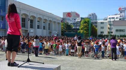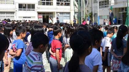 11日(月)朝会は、青空の下、校庭で行いました。全校児童が集合した後、最初に各クラスが整列する縦と横の位置をみんなで確認して、改めて号令のもと整列し直しました。校長講話は、今日から始まった「交通安全運動」について話しました。本校は二子玉川の街中に位置し、道路も狭いところがある割に交通量が多いので、十分に気をつける必要があることを話しました。また、地域の方々が熱心に交通事故の予防に取り組んでくださっていることにもふれました。きちんと整列位置を確認したこともあり、最後までしっかりした姿勢で聞くことができました。