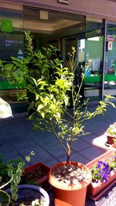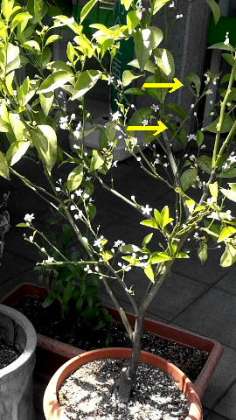 実はこのアゲハチョウの幼虫の大部分は、地元の信用金庫の店先に置いてあったミカンの植木についていたものを、今日、許可をいただいてとってきました。アゲハチョウは、なぜか小さめの木に卵を産む習性があるらしいのです。本校の敷地内にもミカンの木があって、そこからもとってきたのですが、いたのはやはり小さい木の方でした。この木に幼虫がいることを教えてくれたのは、この場所が通学路になっている男の子でした。自然のようすに関心があり、変化によく気がつく子です。(右の写真の黄色い矢印のところにいます)