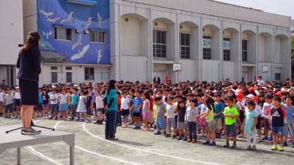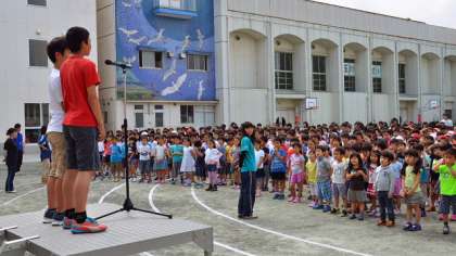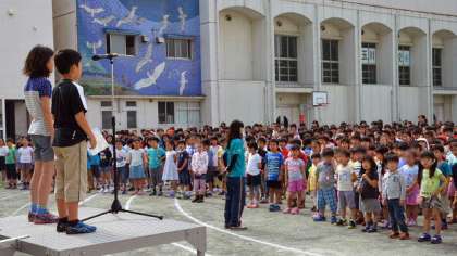 看護当番からは、今週の生活週目標「おちついた給食の時間をすごそう」について事例を交えて話しました。最後に、代表委員会から運動会のスローガンが「力を出しきり戦うぞ!二子の子」に決まったことについての発表が、そして愛鳥委員会からは「愛鳥カレンダー」を委員会で作成し、各教室に配ることの発表が、それぞれ2名の代表児童により行われました。朝会が少し長くなりましたが、子どもたちは、しっかり話を聞くことができました。