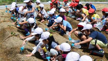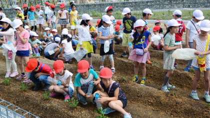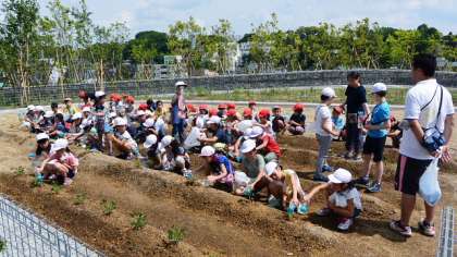 本校の最寄り駅である二子玉川駅の近くに、4月末にオープンした大型商業施設の屋上に、菜園ができました。本校はその一部を借り受けて、栽培活動をすることになり、18日(月)、2年生が屋上菜園に赴いて、植えた苗の世話をしました。この日は、菜園の見学も兼ねて、事前に担任が菜園に出かけて植え付けておいたサツマイモと落花生の苗に水やり作業をしました。学校の敷地内にある学級園は狭いため、2年生は鉢でミニトマトを育てていますが、貸していただくことになった菜園は広く、子どもたちものびのびと活動できました。