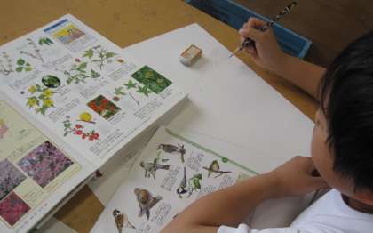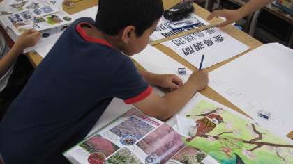 「愛鳥週間ポスター」を描いています。鳥と鳥の住む環境に目を向けて、図鑑で調べたり、KEY BIRDを見たりしながら、イメージを膨らませていました。卒業生が5年生の時に描いたポスターを参考にしている子もいました。愛鳥モデル校ならではの取り組みです。