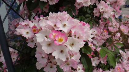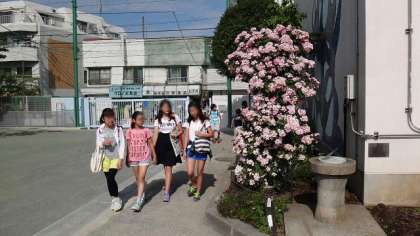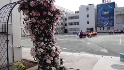 西門から入ったところの二宮金次郎の銅像近くの、バラが満開です。バラといってもバラの一種の「バラ・ピンクコクテール(カクテル)」という種類のようです。小ぶりな一重の花びらで、見事に咲いて目を楽しませてくれています。