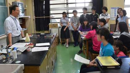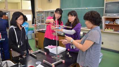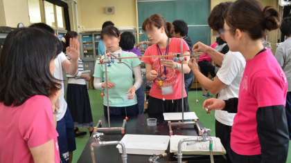 今年度から、教員による学校の研究活動として、理科・生活科に取り組んでいます。20日午後、理科室で研究会を行いました。今日は、教員が理科の授業を体験してみようということで、教師役は校長が務めて5年の振り子の学習をしました。最初に、学習の問題を見いだしていくための導入として、メトロノームの音に振り子のゆれを合わせる実験をしました。いつもは授業をする方の役ですが、児童役になって、けっこうみんな楽しそうです。