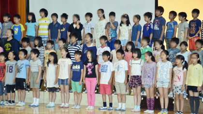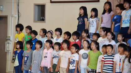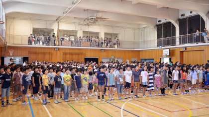2曲目は「いいことありそう」で、「小さな世界」と同じような曲想の短い歌です。どちらも4年生らしい元気で素直な歌声と、歌とマッチしたリコーダーの演奏で、見つめて聞いている他の学年の子どもたちに、その一生懸命な気持ちが届いたようでした。保護者の方もたくさん参観に訪れて、応援してくださいました。(下の写真:写真は体育館後方ですが、横のギャラリーにもたくさんの方がいらっしゃっていました)