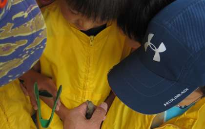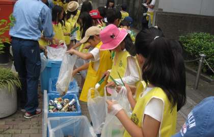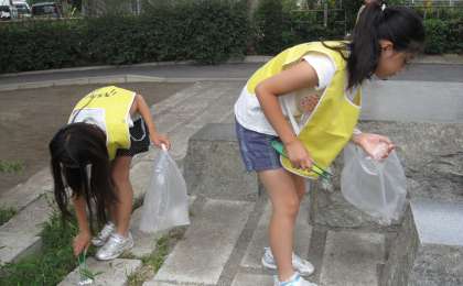 4つの区域を担当するグループにわかれてゴミ拾いを行いました。植え込みのなかにある空き缶やたばこの吸い殻など、子どもたちが熱心に集めました。事前にごみの種類の担当を決めていたので、友達と声をかけ合い、協力して進めることができました。途中でヤモリを発見!(真ん中の子の手元に注目 けっこう大きいヤモリでした)実物を見たのは、初めてだった子が多く、しばらくの間、みんなで観察をしました。集めたゴミは集積所にもっていって、係の方から分別の仕方を習って捨てました。自分たちが住む街を自分たちの力できれいにして、子どもたちは満足そうにしていました。