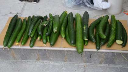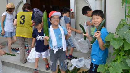 今年度から体育館の西側に設置したグリーンカーテンが、ご覧のようにぐんぐん伸びています。そして・・・今キュウリがたくさんなり始めています。7日収穫したところたくさんとれたので、「二子ニコひろば」に参加した児童に分けました。ちょっとおおきくなりすぎたものもあったのですが、みんな喜んで持ち帰ってくれました。