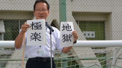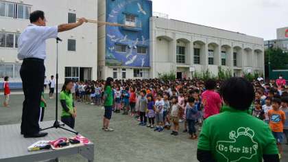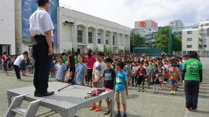 8日(月)朝会は校庭で行いました。今朝のあいさつ当番はとても元気よく息が合っていて、みんなのすばらしいあいさつの声が響きました。うれしいですね。校長講話では、地獄と極楽を見学した人がそれぞれの食事のようすを見学したたとえ話をしました。どちらも目の前の大きなテーブルにはおいしそうな食べ物がたくさん並んでいます。ところが食事の時はいすにしばりつけられ、食事に使う箸(はし)はとても長くて、自分の口に食べ物を運ぶことができません。地獄で食事をしている人たちは、必死に自分の口に食べ物を運ぼうとしますが、全く食べることができずに食事の時間が終わってしまします。ところが極楽の人たちは互いの口に食べ物をはこんで楽しくおいしい食事を満喫することができるのでした・・・というお話です。小道具の長い箸をもって実演しながら話したところ、みんなしっかり聞いていました。さて、このお話から考えられる教訓は?