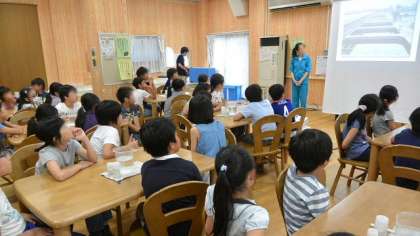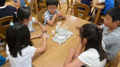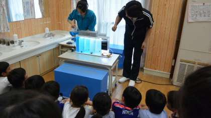 8日(月)、社会で水道について学習している4年生が、東京都水道局の出前授業「水道キャラバン」の学習をしました。各クラス2時間ずつ、映像による水道水の説明や、実験を通して、水源林から家庭までどのように水道の水がとどくのかを学ぶことができました。授業のようすを3クラスとりまとめて紹介します。写真は、浄水場の模型の実演とビデオを使った学習のようすです。