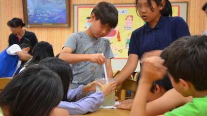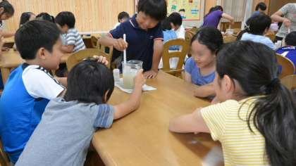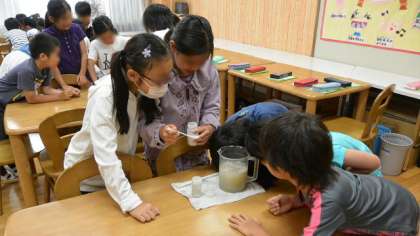 ビデオ学習の次は、水を実際に濾過する実験です。わざと濁りの元を入れた水に凝集剤を入れると、プチプチと溶ける音がしました。そしてそれをかき混ぜます。さあどうなるかな?