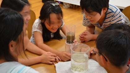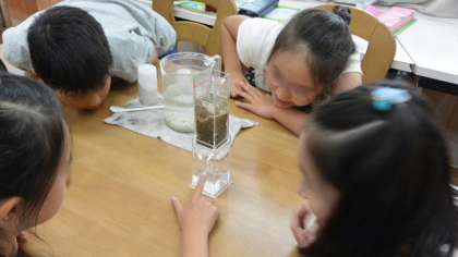 濁りが沈殿した水を小石と砂がはいった濾過器でろ過すると、透明な水のできあがりです。本物ではこの後、臭いをとり、殺菌をして水道水になります。最近はこの過程でオゾンを使う高度浄水処理の方式が使われていることも学習しました。