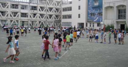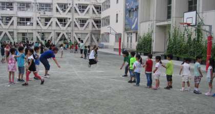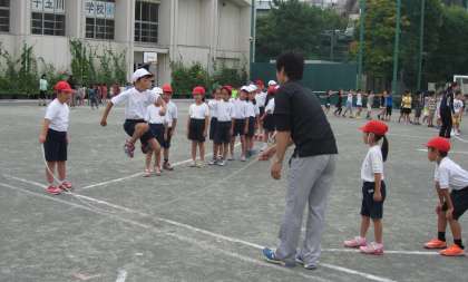 10日(水)、1・2年生の体育朝会を行いました。今朝は長なわ跳びの「8の字跳び」に挑戦しました。子だちたちが跳びやすいように、ラインを引いて並ぶ位置を示したり、ぬける方向を示したりしました。短時間の内に、リズムよく跳べるようになった子がたくさんいました。