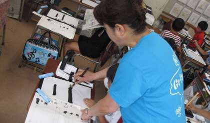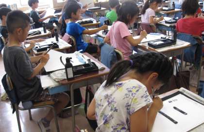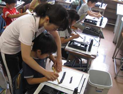 3年生になって学習が始まる、毛筆を使用した書写の授業の様子です。漢字の「二」の文字を始筆、送筆、終筆の穂先の動きを意識しながら書きました。子どもたちは、落ち着いた雰囲気の中、一生懸命取り組んでいました。感覚をつかむために担任と一緒に書く場面も見られました。